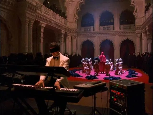 The infamous orgy scene borrows the aesthetics of satanic ceremony. Cloaks. Candles. Chants. What is being marked as dangerous is not sex itself, but unsanctioned desire. Desire without transparency, without narrative justification. The masks signal both protection and threat. To desire anonymously is to become monstrous. To step outside normative sexual scripts is to risk being cast as evil.